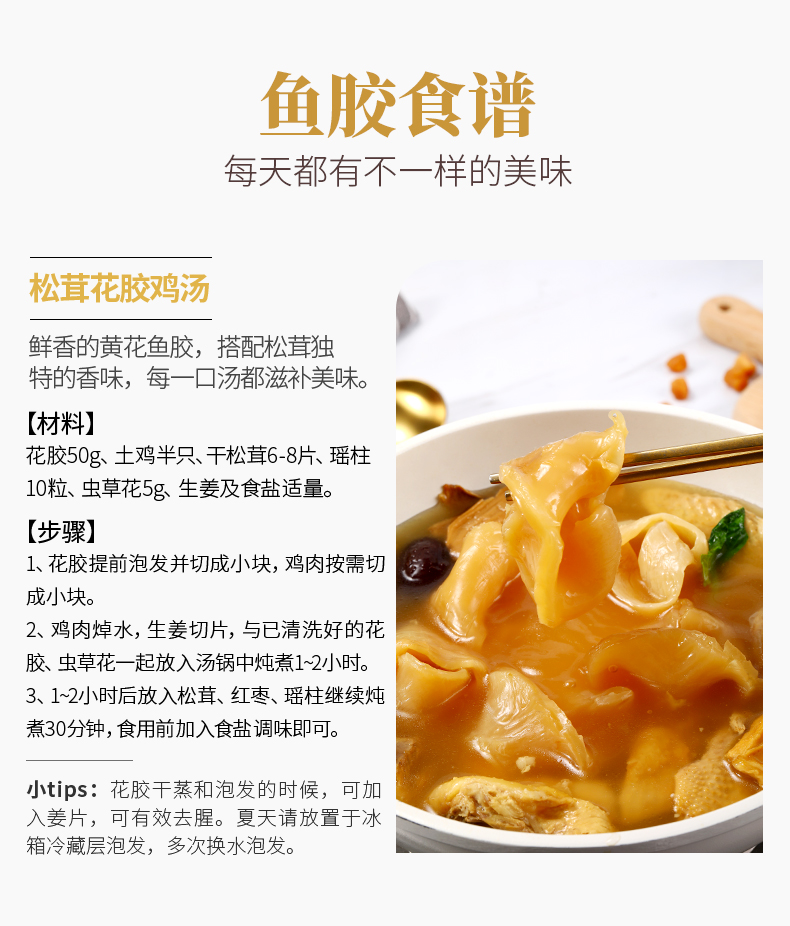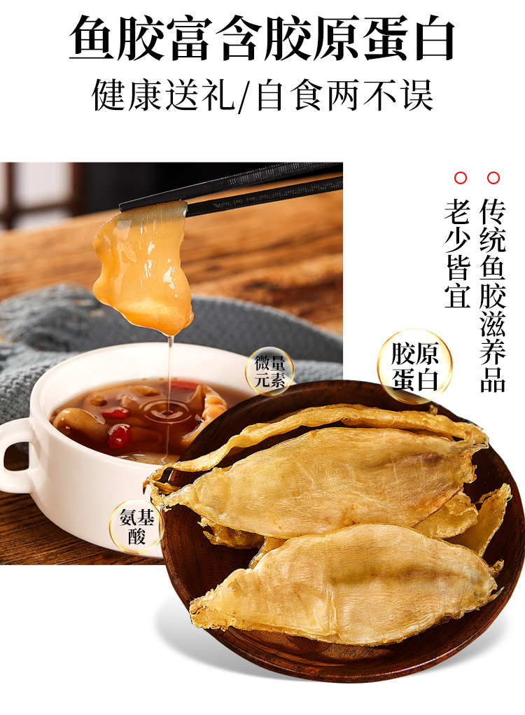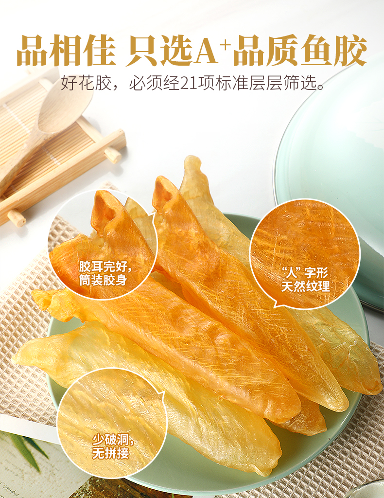 花膠即魚肚,是各類魚鰾的干制品,以富有膠質(zhì)而著名,故名為花膠?;z又名魚肚,是從魚腹中取出魚鰾,切開曬干后而成?;z含有豐富的蛋白質(zhì)、膠質(zhì)等,食療有滋陰養(yǎng)顏、固腎培精之效,可令人迅速消除疲勞。頂級(jí)魚肚排名依次是魚膠之王:金錢鳘魚膠、白花膠、黃鱘膠、黃花膠、鳘魚膠?;z不僅是筵席名菜,還有相當(dāng)?shù)淖萄a(bǔ)價(jià)值。